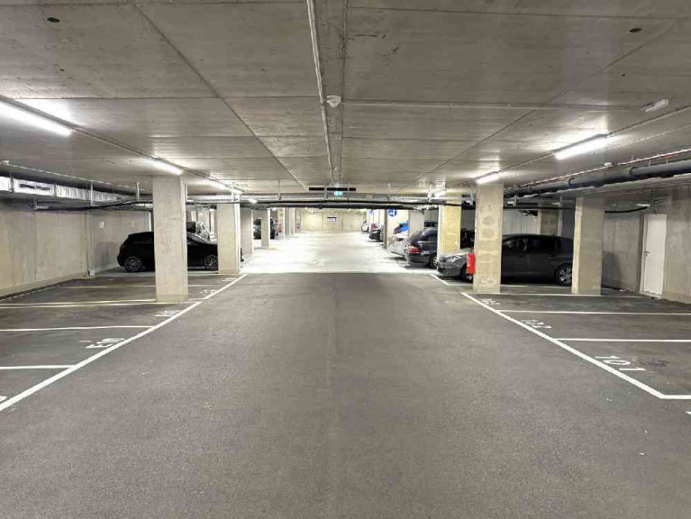 In der quartierübergreifenden Tiefgarage stehen liegenschaftseigene Autostellplätze zur Verfügung, sodass der gesamte Freiraum an der Oberfläche- mit Ausnahme der Zufahrt für Einsatzfahrzeuge- komplett autofrei gehalten werden kann.