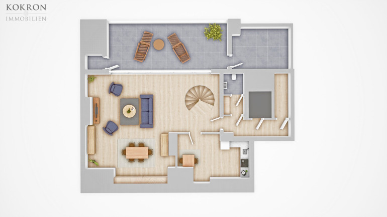 Über die Innenstiege oder direkt mit dem Lift gelangen Sie ins zweite Dachgeschoss, das Ihnen den Zugang zu der Küche, einem großzügigen rund 48,67m² großen Wohnsalon, einem Abstellraum und einem Gäste-WC bietet. Der schöne Wohnsalon öffnet sich zur großen Terrasse mit herrlichem Fern- und Grünblick.