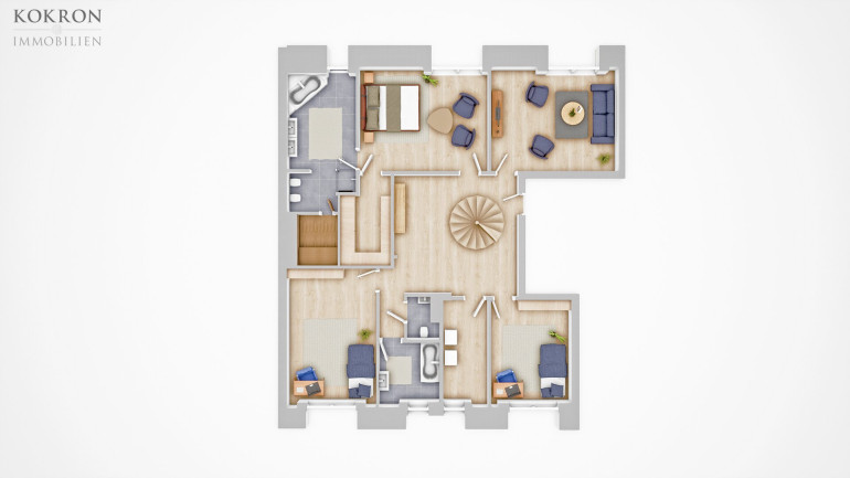 Die Wohnung besteht aus insgesamt fünf Zimmern, einer Küche, drei WCs (zwei davon separat), zwei Bäder (eines mit einer Dusche, Whirlpool und Sauna) und wird wie folgend beschrieben aufgeteilt: