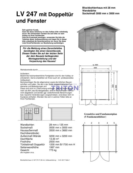 Eine Gartenhütte aus Holz (3x3m) mit Baujahr 2021, in blaugrau/weiß gehalten, auf einem Vollfundament mit einem verfliesten Vorbereich (1,5x3m) aus frostfesten und pflegeleichten Fliesen. Eine Leerverrohrung für Strom ist vorhanden.