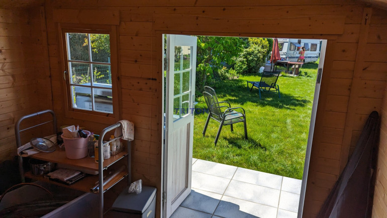 Blechhütte: Eine zusätzliche Blechhütte dient zur Aufbewahrung von Geräten, Fahrrädern usw.