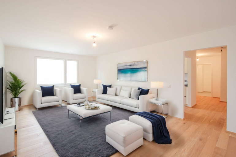 Die im Foto dargestellten Wohnzimmermöbel sind digitale Visualisierungen und ein Einrichtungsbeispiel. Möbel sind nicht Gegenstand des Kaufobjektes.