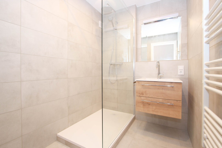 Die Wohnung bietet einen offenen Wohn-/Schlafbereich, der vielseitig nutzbar ist und ausreichend Platz für individuelle Einrichtungsmöglichkeiten bietet. Direkt daneben befindet sich das Esszimmer mit einer neuen, modernen Einbauküche*. Diese ist komplett mit AEG-Geräten „Dieter Knoll Design-Edition“ ausgestattet. Das WC ist getrennt vom modernen Wohlfühl-Badezimmer. Dieses überzeugt durch die großzügige Walk-in-Dusche (Artweger Klar-Glaswand mit Artclear-Beschichtung) und stielvolle Fliesen. Sämtliche Sanitärkeramik ist von „Laufen“ und die Armaturen von „Grohe“. Ein großzügiger Abstellraum mit Anschlussmöglichkeiten für Waschmaschine und Trockner sorgt für zusätzlichen Stauraum.