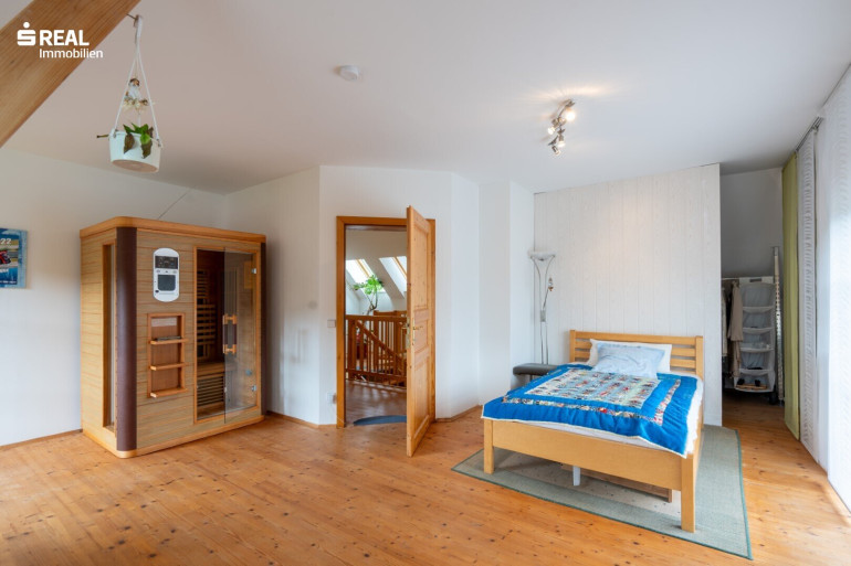 OG: Diele, Bad und WC, 2 Schlafzimmer (Infrarotkabine), Balkon