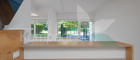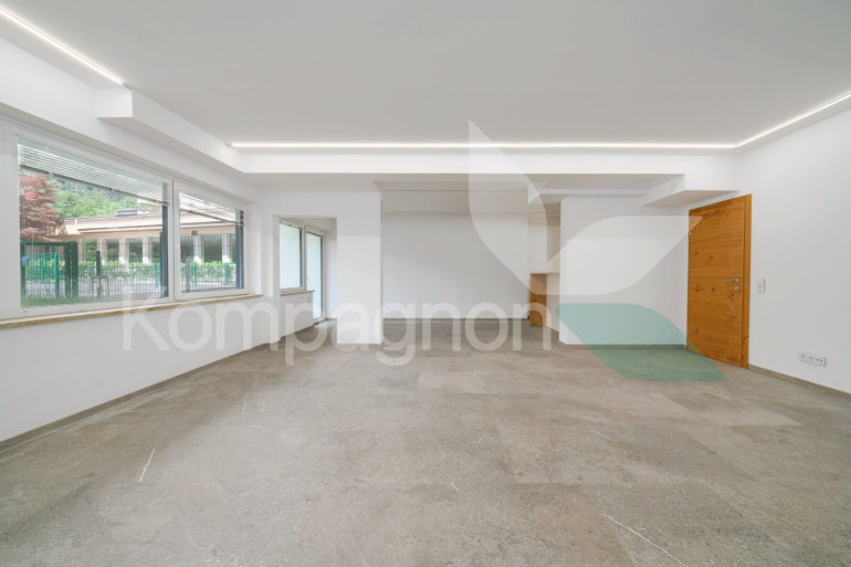 - Wohnraum mit großzügiger Fensterfront und Blick auf die Terrasse
