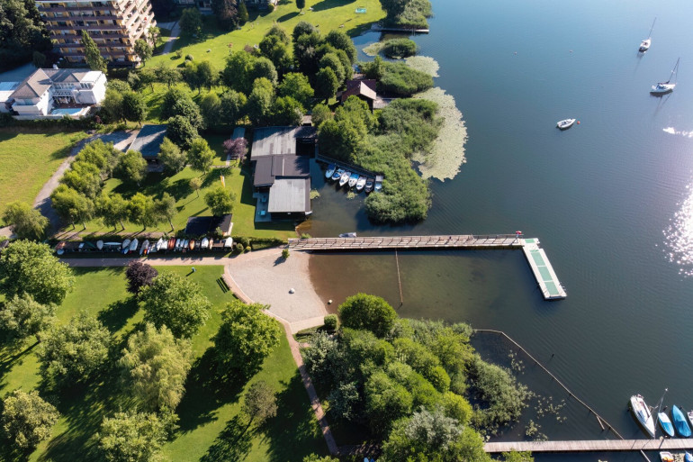 - Liegewiese in der Größe von ca. 1,3 ha mit Lagermöglichkeiten für Boote und einen Beachvolleyballplatz