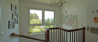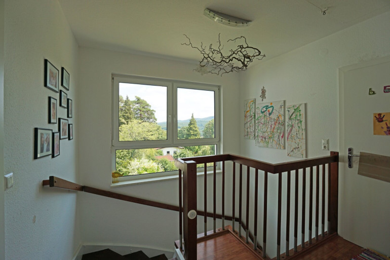 Großes Stiegenhausfenster mit Morgensonne und Fernblick