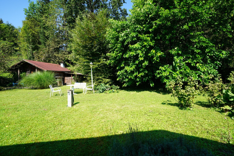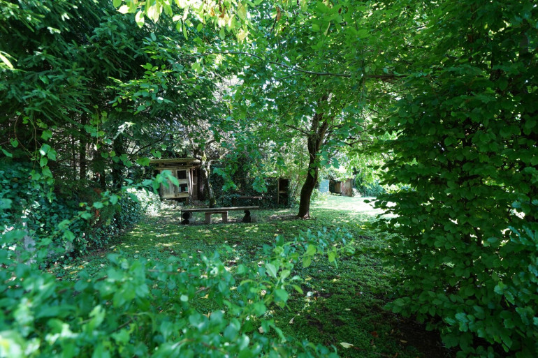 Auf der Rückseite befindet sich ein von Bäumen und Hecken begrenzter nicht einsehbarer "verwachsener" Garten mit einem liebevoll dekorierten Gartenhaus (samt Kamin), Obstbäumen und einem Regenwasser-Reservoir. Dieses Kleinod ist nicht nur ein wunderbar Rückzugsort, sondern bietet auch Platz für die Anlage von Gemüsebeeten, Beerensträuchern, ... zur Selbstversorgung.