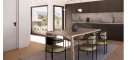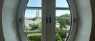 Das ovale Fenster bietet aus der großzügigen Wohnküche einen spektakulären Ausblick auf das Stift Klosterneuburg (blauer Pfeil im Plan).