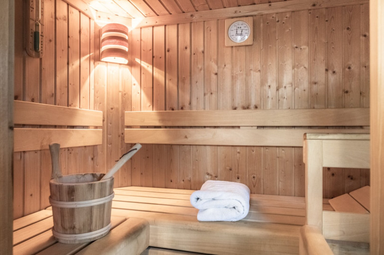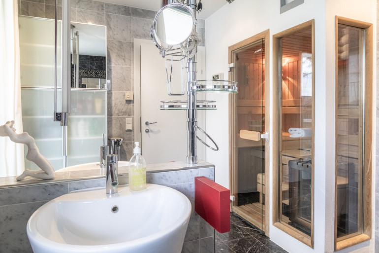 - Badezimmer: 2 (ein Badezimmer mit Sauna, Dusche, Wanne und Doppelwaschbecken, ein Duschbad)