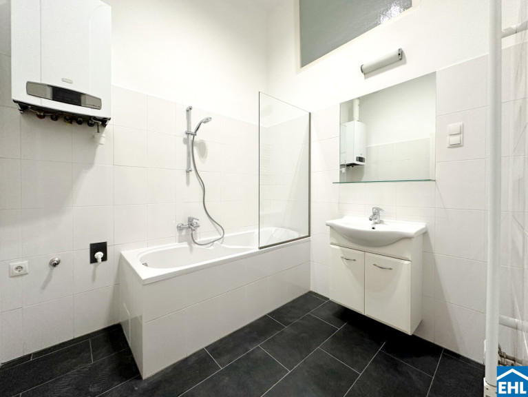 * Badezimmer mit Badewanne und Waschmaschinenanschluss