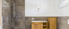 Das moderne Badezimmer, direkt an die Garderobe anschließend, ist hochwertig ausgestattet und bietet edle Fliesen, eine großzügige Dusche, einen eleganten Waschtisch sowie exklusive Sanitärelemente.