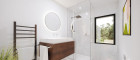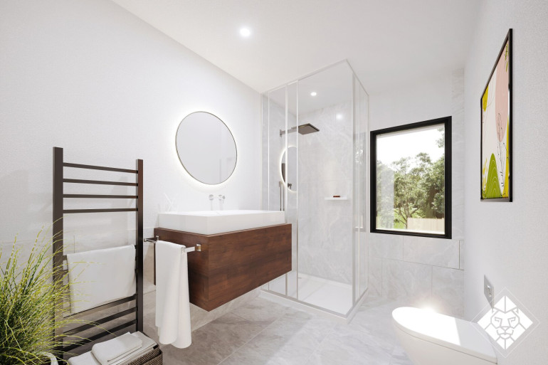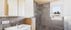 Das stilvolle Tageslichtbad schließt sich an die Garderobe an und überzeugt mit moderner Ausstattung: edle Fliesen, eine geräumige Dusche, ein eleganter Waschtisch und hochwertige Keramikelemente. Auch an den praktischen Abstellraum für Waschmaschine und Trockner wurde gedacht.