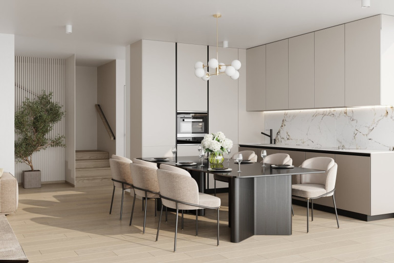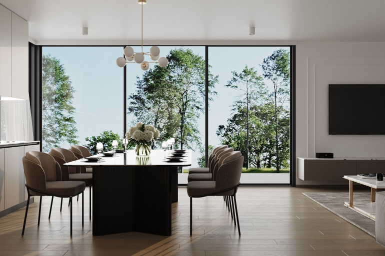 Moderne Architektur, hochwertige Ausstattung, großzügig und offen geplante Wohnräume verbreiten ein entspannendes Raumklima und ermöglichen eine flexible Nutzung und Platzierung der Einrichtung. Großflächige Fenster stellen eine hohe Nutzung von Tageslicht sicher und gewähren einen wunderbaren Ausblick.