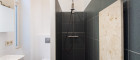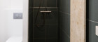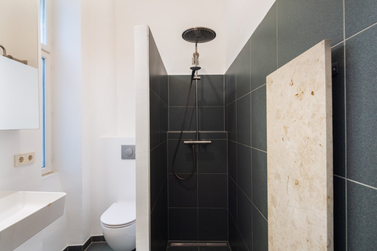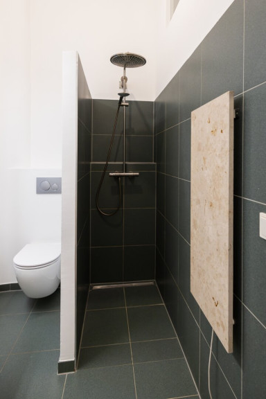 Das Badezimmer ist mit ansprechenden Fliesen ausgestattet und verfügt über eine Dusche. Für zusätzlichen Komfort sorgt eine Marmor-Infrarotheizung, die eine angenehme und effiziente Wärme im Bad bietet.