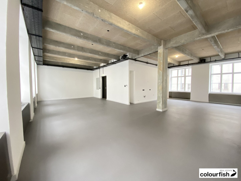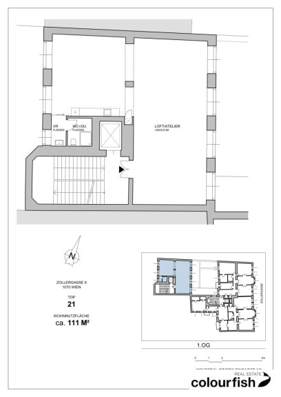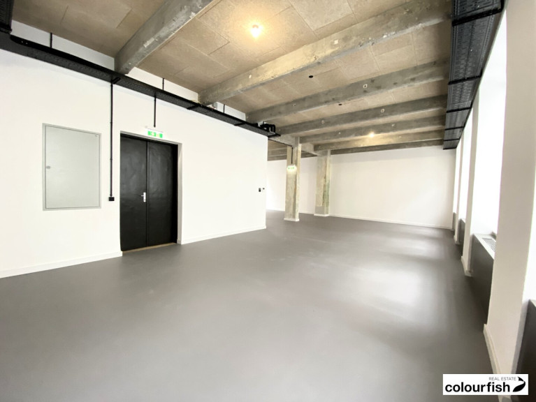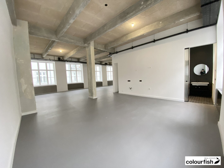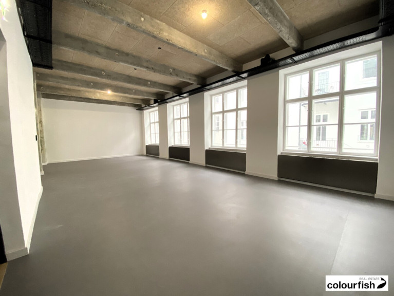 Die Fläche misst ca. 111 m² und befindet sich im 3. Obergeschoss mit Lift. Das Objekt gliedert sich in einen über die gesamte Fläche offenen, loftartigen Raum, der aber theoretisch noch getrennt werden könnte. Eine Teeküche ist vorhanden sowie ein Sanitärbereich mit WC und Dusche.
