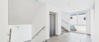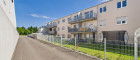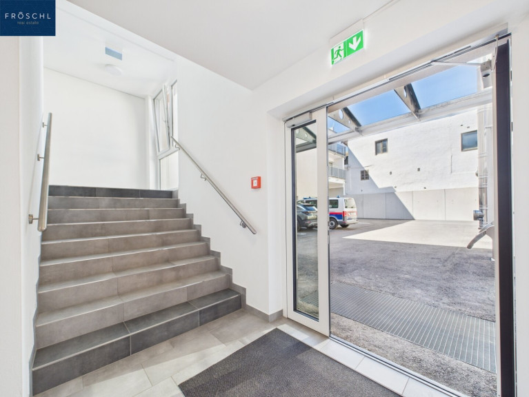 - Im Innenhof: Überdachter Haupteingang mit Zugang zum zentralen Stiegenhaus mit Aufzug, der alle Wohnungen barrierefrei erschließt.