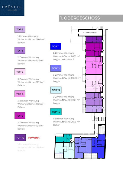Die geplante Wohnhausanlage umfasst insgesamt 24 moderne Wohnungen sowie eine Büroeinheit, die auf drei Geschosse(Erdgeschoss, 1. Obergeschoss und 2. Obergeschoss) verteilt sind. Die Wohnungen Top 5 bis Top 14 im 1. Obergeschoss sind bereits bei Fertigstellung mit einer Einbauküche ausgestattet.