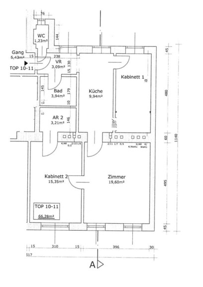 Die Wohnung befindet sich im 2. Stock ohne Lift. Der Vorraum erschließt rechterhand das großzügige Badezimmer mit Badewanne und Dusche und das gegenüberliegende, separierte WC mit Fenster. Geradeaus geht es in die Küche sowie das hofseitige Kabinett mit rd. 10m2. Südseitig und über die Küche erschlossen befindet sich ein Wohnzimmer sowie ein Schlafzimmer mit angrenzender Garderobe.