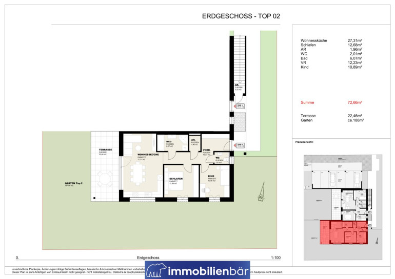 Top 2 - ca. 72,66m² - 3 Zimmer Gartenwohnung im EG - ca. 188m² Garten