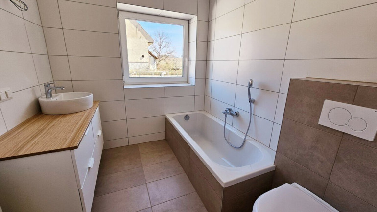 Aufgeteilt in einen Vorraum, Abstellraum, Badezimmer mit Badewanne und Fenster, WC, Küche mit Fenster, Essbereich mit Zugang zur Ost-Südterrasse, Wohnzimmer mit Zugang zur Ost-Südterrasse, 2 Schlafzimmer.