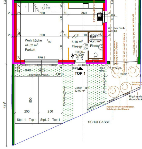 Im Erdgeschoßes angekommen, stehen Ihnen rechterhand das WC mit Handwaschbecken und Dusche zur Verfügung. Gehen Sie links, gelangen Sie in die großzügig konzipierte Wohnküche, zum Stiegenaufgang in das Obergeschoß sowie weiters in den Garten.