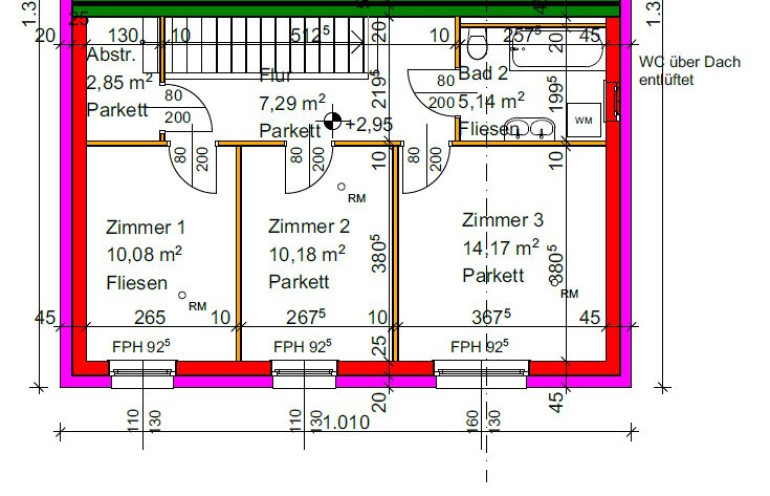 Das Obergeschoß besticht durch 3 Zimmer (Schlafzimmer, Kinderzimmer, Büro, Gästezimmer,...), einen Bad mit WC sowie einen Abstellraum.
