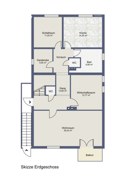 Stiegen zum Eingang sind seitlich an das Haus angebaut. Der schon ausgebaute Dachboden bietet zusätzlich Möglichkeit zur Schaffung von Wohn- oder Stauraum.