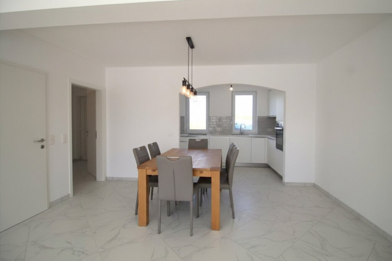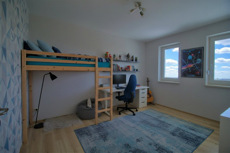 Das Erdgeschoss ist offen gestaltet - offener Küchen-, Ess- und Wohnbereich. Der Technikraum befindet sich imErdgeschoss beim Eingangsbereich. Drei weitere Zimmer befinden sich im Obergeschoss, wo sich auch das Badezimmer mit Fenster und ein extra WC (auch mit Fenster), befinden.