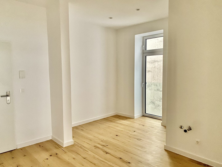 Vom Eingangsbereich gelangt man in die große Wohnküche. Durch das bodentiefe Fenster wirkt der Raum nicht nur extravagant, sondern auch sehr hell. Das lichtdurchflutete Wohnzimmer ist mit fast 24 m2 großzügig bemessen. Neben dem zentral zu begehenden Bad mit Badewanne, befinden sich das Schlafzimmer und ein Kabinett.
