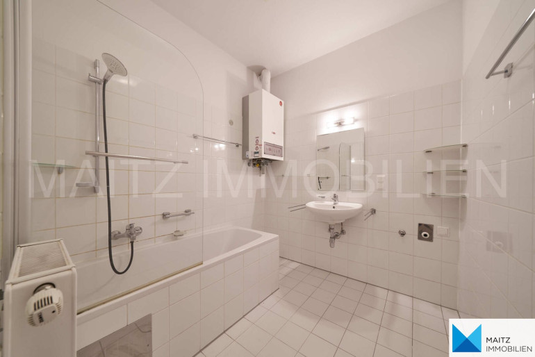 + Bad (weiß gefliest, Badewanne; WM-Anschluss; Gas-Kombitherme)