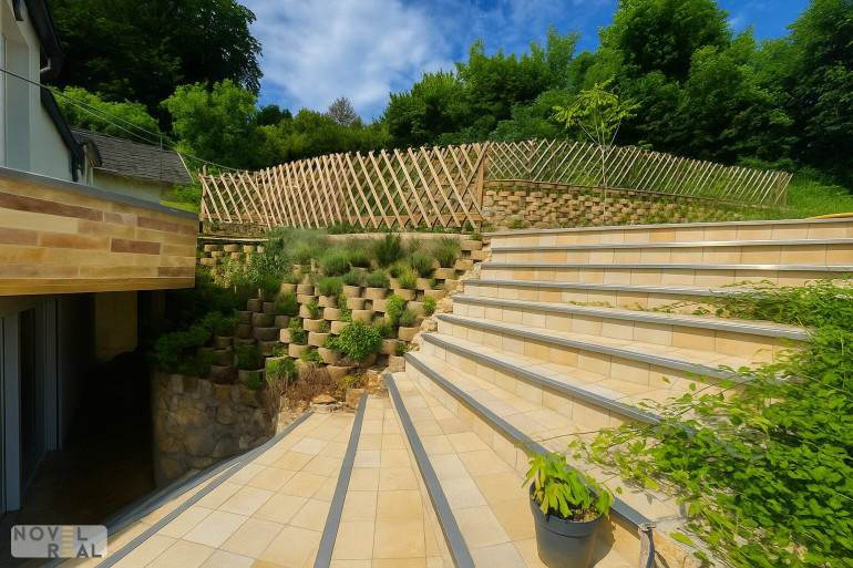 - Energieeffiziente Luftwärmepumpe und Natursandsteinfliesen für ein nachhaltiges Wohnerlebnis.