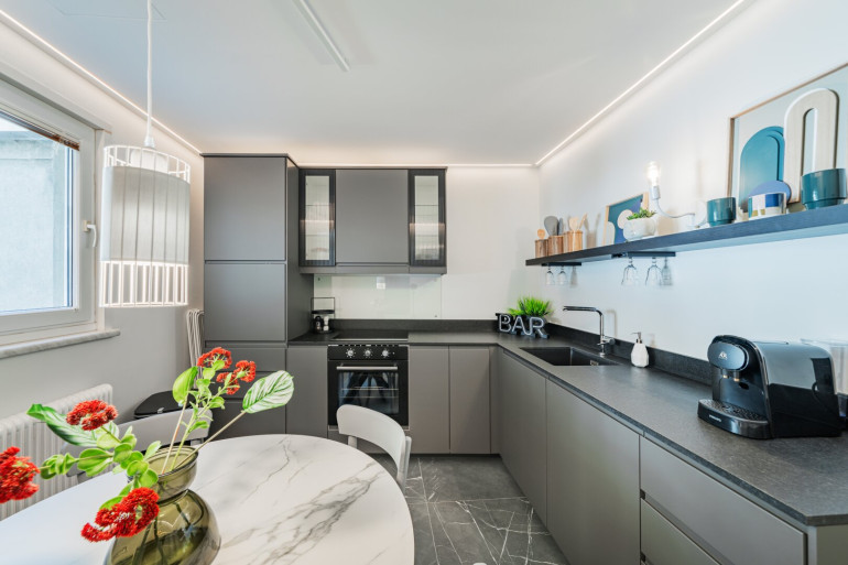 • Moderne Einbauküche: Büro verfügt über eine hochwertige Einbauküche, ausgestattet mit Geschirrspüler, Waschmaschine sowie einem Kühlschrank mit Gefrierfach.
