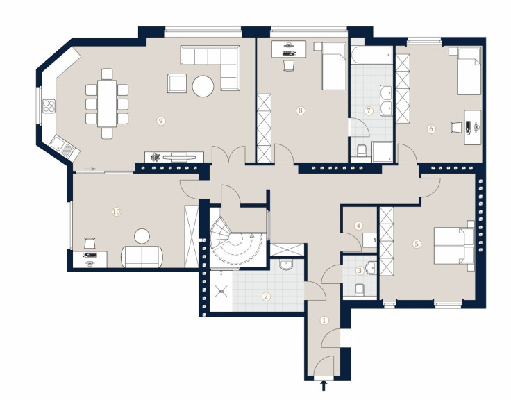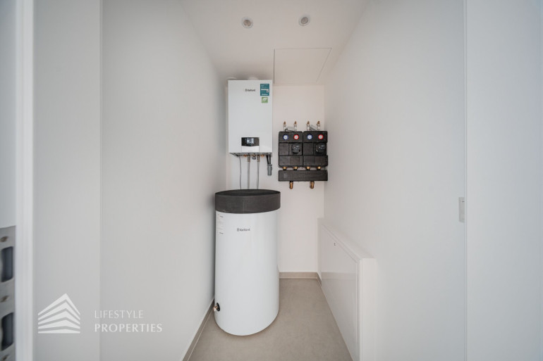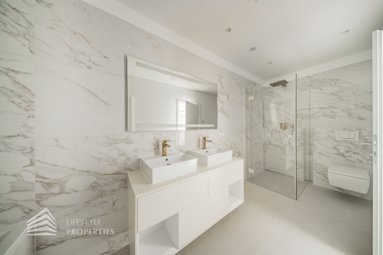 Die Wohnung befindet sich im 1. DG, ist bequem über einen Personenaufzug erreichbar und ist ein Erstbezug. Die Wohnfläche von ca. 172,35 m² teilt sich in eine große Wohnküche, vier Schlafzimmer, zwei Bäder, einen Abstellraum und ein separates WC auf. Zudem verfügt die Wohnung über eine Terrasse mit insgesamt ca. 99,50 m². Die Wohnung ist mit hochwertigem, französischen Fischgrät-Parkett ausgekleidet, in den Nassräumen sind luxuriöse Fliesen verlegt.