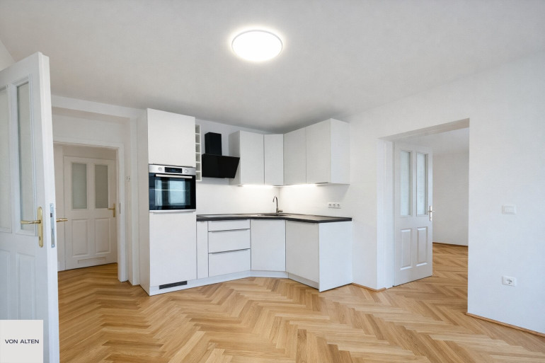 Vom Eingangsbereicherreicht man das Badezimmer, das mit einer Dusche und Waschbecken sowie Waschmaschinenanschluss ausgestattet ist. Die Toilette ist separat. Im Eingangsbereich steht außerdem ein offener Abstellraum zur Verfügung. Ebenfalls zentral begehbar ist die Wohnküche mit Einbauküche, welche an die zwei Zimmer angrenzt. Die Raumaufteilung ermöglicht bis zu zwei Schlafzimmer. Es wurde Fischgrätparkett im gesamten Wohnbereich verlegt. Ein Kellerabteil bietet zusätzlichen Stauraum.