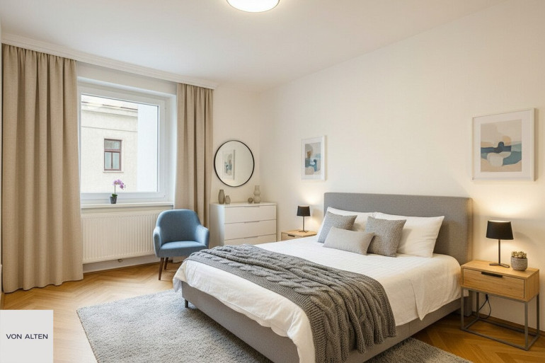 ***Bitte beachten Sie, dass es sich bei den abgebildeten Einrichtungsgegenständen um Visualisierungen handelt. Da die Wohnung derzeit noch bewohnt ist, wurden die Bilder zur besseren Veranschaulichung erstellt, um die Potenziale des Raumes darzustellen.***