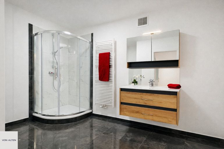 + Badezimmer mit Dusche und Waschmaschinenanschluss