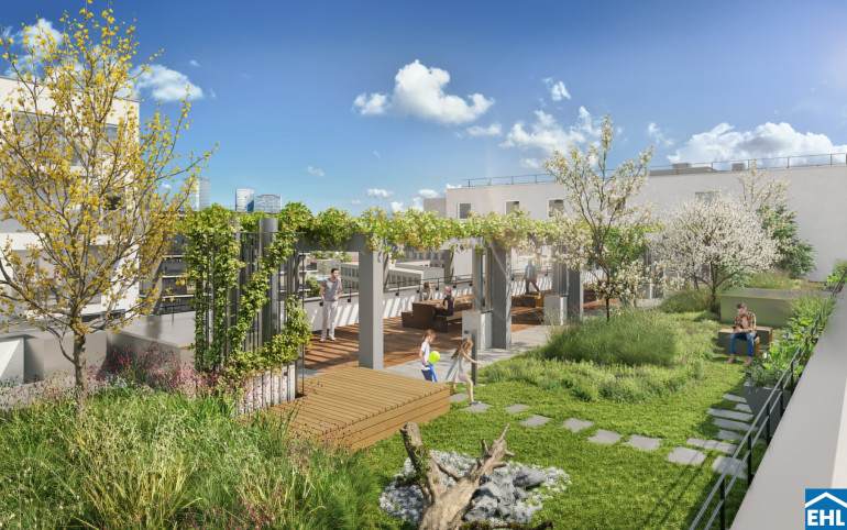 Einladende Sitzbereiche, Pergola-Überdachungen und ein wunderschöner Blick in den Park laden zum Verweilen ein. PARK FLATS vereint urbanes Wohnen und Natur auf ideale Weise – ein Ort, um das Leben in all seinen Facetten zu genießen.