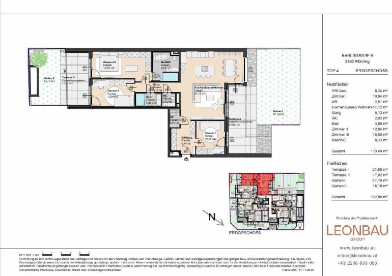 Leon Bau steht seit 2006 für höchsten Komfort, was sich auch in diesem Projekt erneut widerspiegelt. Das Neubauprojekt Karl9“ steht für modernes Wohnen auf höchstem Niveau. Die Architektur mit klaren Linien und offen gestalteten Grundrissen schafft ein einzigartiges Wohngefühl. Große Fensterflächen sorgen für lichtdurchflutete Räume, während hochwertige Materialien ein stilvolles Ambiente garantieren. Besonderes Augenmerk wurde auf eine nachhaltige und energieeffiziente Bauweise gelegt. Die durchdachte Gestaltung der Fassade sowie die Auswahl hochwertiger Tür- und Fensterelemente tragen maßgeblich zur Reduzierung des Heizwärmebedarfs und zur Optimierung der Energieeffizienz des Gebäudes bei.Insgesamt entstehen 17 exklusive Eigentumswohnungen auf 3 Geschossen mit Wohnflächen zwischen ca. 56 m² und ca. 123 m². Jede Einheit verfügt entweder über einen privaten Garten mit Terrasse, einen großzügigen Balkon und/oder eine Loggia, die zusätzlichen Wohnraum im Freien bietet. Selbstverständlich stehen in diesem exklusiven Objekt 29 Tiefgaragenplätze zur Verfügung.