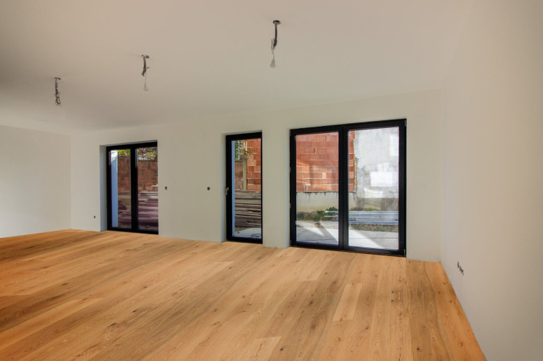 - Parkettböden in Wohnräumen, großflächige (60x120) Fliesen in Nassräumen