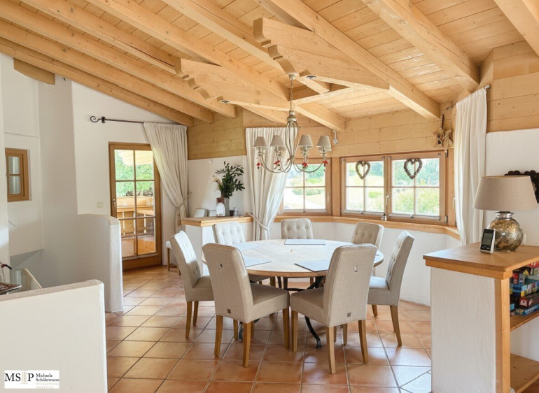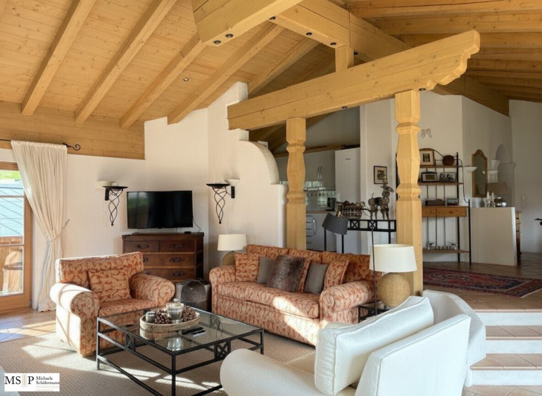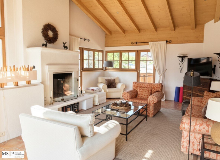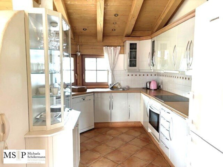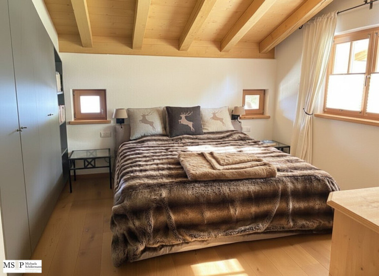 Im Dachgeschoß mit ca. 120 m² WNfl. befindet sich der offene Wohnbereich mit Sichtdachstuhl und offenem Kamin, ein Essbereich für 8 Personen, eine moderne, weiße Küche mit Markengeräten, die große Schlafsuite mit Ankleide und angrenzendem Badezimmer sowie ein Gäste-WC. Das Haus wird gemeinschaftlich angeboten und verkauft. Die Balkone mit Ausblick auf die Bergwelt sind rundumlaufen und versprechen ganztags Sonne und Erholung pur.