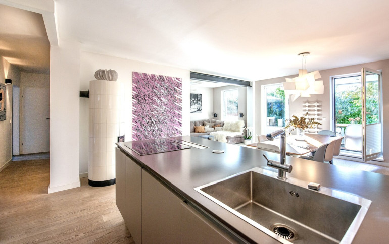 Die Küche wurde 2020 saniert und durch eine Poggenpohl Designerküche mit moderner High End Kochinsel ersetzt. Diese fügt sich wunderbar in das Raumkonzept ein und ist der perfekte Ort um gemeinsam zu kochen und zu genießen.