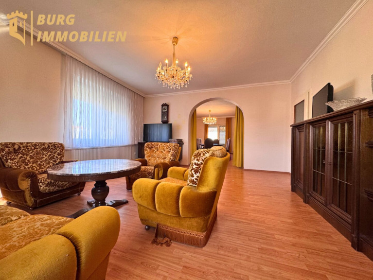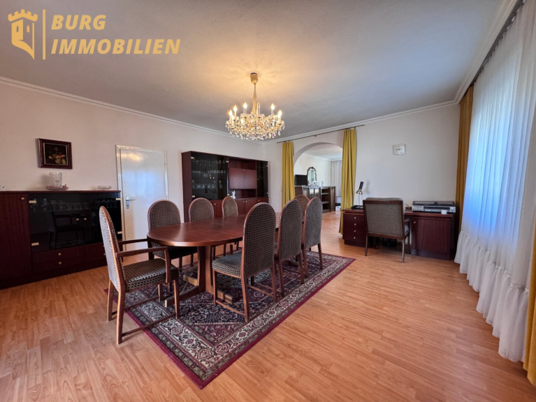 - Wohn- und Essbereich: Großzügiges Wohnzimmer mit Rundbogen in zwei Einheiten unterteilt (Wohnzimmer & Esszimmer) und direktem Zugang zur Terrasse (31 m²)