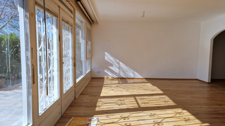 -) sehr helles, großes Wohnzimmer mit Ausgang zur eigenen Terrasse (ca. 25m² inkl. Markise) bzw. Gartenanteil