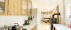Maßgefertigte Tischlerarbeiten führen ins Innere, wo sich Holzböden durch eine durchdachte offene Küche und einen Wohnraum ziehen. Naturholz Schränke heben sich von weißen Wänden und Arbeitsplatten in der Küche ab und führen diese Harmonie im ganzen Haus fort.