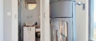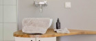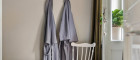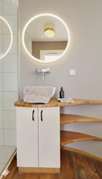 Ein separater Abstellbereich maximiert die verfügbare Grundfläche, während ein eigenes Bad auf dieser Ebene, mit einer Regendusche, einem WC und einen Holzschrank unter dem Waschbecken für zusätzlichen Stauraum, ausgestattet ist.
