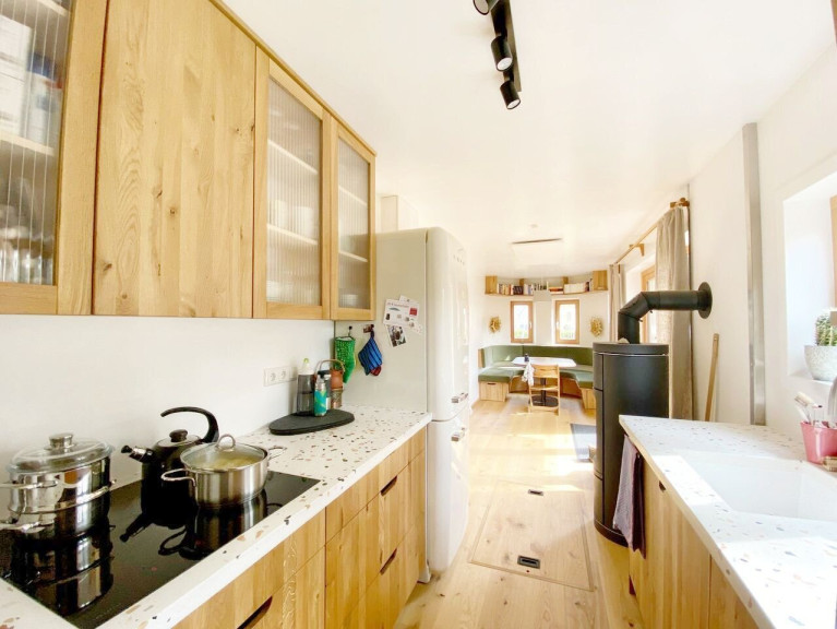 Dielenboden, Parkett, Elektro, Heizofen, Einbauküche, Wohnküche / offene Küche, Bad mit Fenster, Dusche, Parkplatz