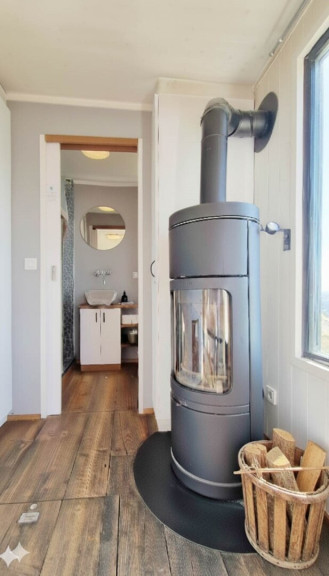 Ein stimmungsvoller Raum zum Essen oder Unterhalten, in dem Sie in den wärmeren Monaten die Türen öffnen oder den Holzofen anzünden können, wenn es kalt wird.
