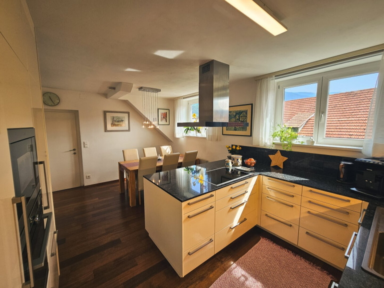 Das Haupthaus sowie das hinterrücks gelegene Nebengebäude verfügen über insgesamt vier WCs und drei Badezimmer, sodass Sie und Ihre Familie jederzeit ausreichend Platz und Komfort genießen können. Die hochwertig ausgestattete Dachgeschosswohnung (Parkett, neuwertige DAN-Einbauküche, großes Bad und Panoramafenster) über den Dächern von Feistritz an der Drau bietet mit seinen lichtdurchfluteten Räumen ein hohes Maß an Lebensqualität. Die moderne Einbauküche ist ein Traum für jeden Hobbykoch und lässt keine Wünsche offen. Der zwischen den Gebäuden liegende Garten bietet eine geschützte Rückzugsfläche inmitten des Ortskerns.