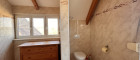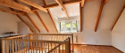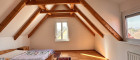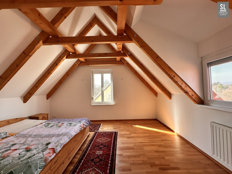 Die schöne Massivholz-Stiege führt Sie in das ausgebaute Obergeschoss mit offenem Dachstuhl. Hier ist ein geschmackvoller Parkettboden verlegt. Links, oberhalb der Küche, befindet sich ein großes Schlafzimmer mit zwei Fenstern, die mittels Rollläden zu verdunkeln sind. Der Westgiebel dient als weiterer Wohnbereich. Hier könnte man auch ein drittes Schlafzimmer gestalten. Hinter der Galerie, rechts neben dem Badezimmer, befindet sich ein Schrankraum unter der Dachschräge. Das Badezimmer ist sehr geräumig mit Dusche, Waschbecken und optisch abgetrenntem WC ausgestattet. Zwei Fenster sorgen für viel natürliches Licht.